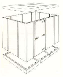 As câmaras pré-moldadas, feitas em qualquer dimensão com o uso de painéis isolante modulares, permitem tempo breves de construções economia nas fundações, na ampliação e na remoção. Os longos tempos de construção e o alto custo das obras em alvenaria contribuíram para a difusão das câmaras pré-moldadas, construídas por painéis isolantes pré-moldados, com característica de rigidez estrutural obtida com acoplamento do isolante propriamente dito e camadas de revestimentos. Estes painéis são conectados entre eles por meio de junções metálicas. As vantagens desta solução construtiva são a rapidez da colocação e a possibilidade de sucessivas ampliações. Com estes tipos de painéis é possível também construir câmaras frigoríficas de grande porte. As características auto-portante dos painéis isolantes mudam segundo o tipo da construção. Ultrapassando determinadas dimensões de painéis nascem problemas de envergadura do teto que são solucionados com estruturas metálicas externas ou internas. A ampla disponibilidade de materiais de revestimento do painel (existem painéis revestidos nos dois lados com chapa de aço inox), permite a construção de câmaras frigoríficas que resistem às intempéries com ótimas características de isolamento e impermeabilidade.